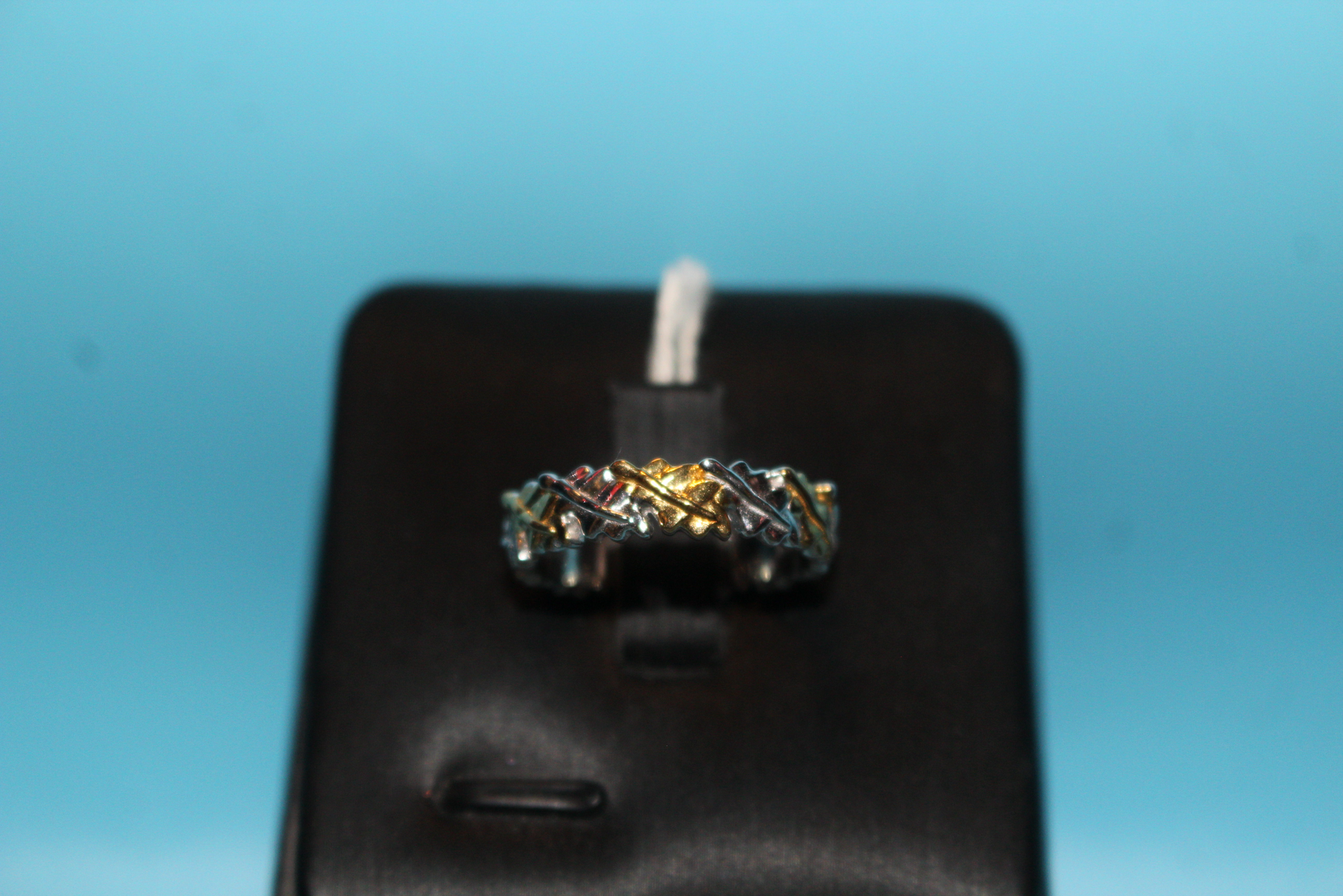 This elegant wedding band ring combines luxury and durability with its 18K Vermeil Yellow Gold and Platinum Plated Sterling Silver material. Size p ensures a comfortable fit. Make a sophisticated statement with this high-quality, expertly crafted piece.