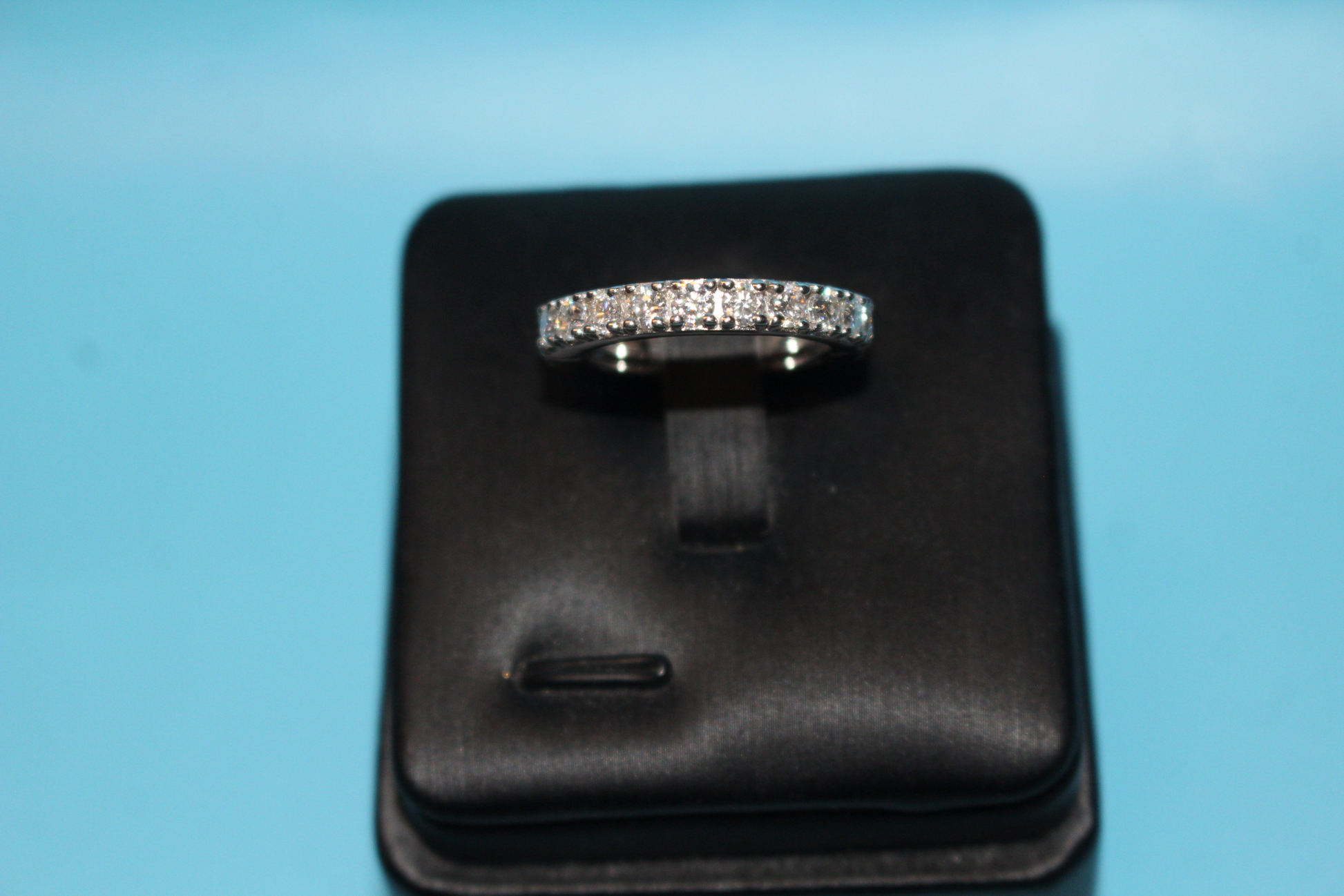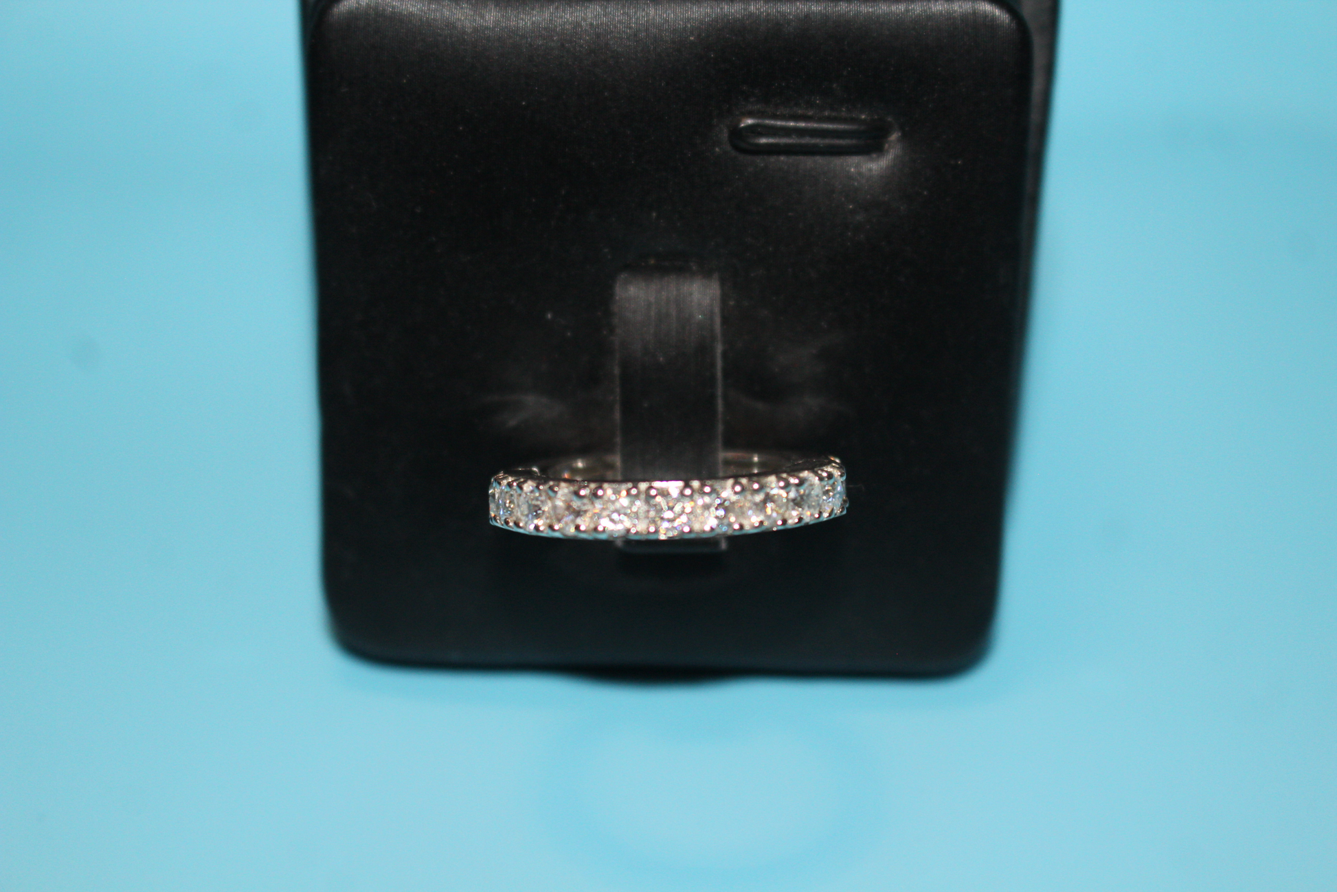 This Moissanite Full Eternity Band Ring features a continuous circle of sparkling 1.96-carat moissanite stones, expertly set in platinum overlay sterling silver. The design offers enduring brilliance and durability, making it an elegant choice for daily wear or special occasions. Its full eternity style symbolizes everlasting commitment, while the platinum overlay enhances both shine and resistance to tarnish. Ideal for those seeking a sophisticated and lasting piece of fine jewellery.